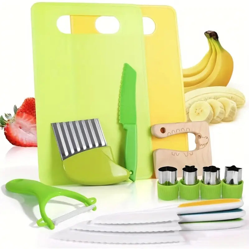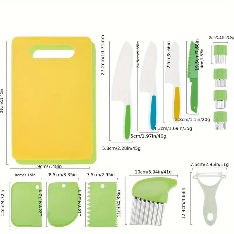 Deze kindvriendelijke, multifunctionele set bevat alles wat nodig is om groenten en fruit te snijden, te schillen en te ontdekken hoe leuk koken kan zijn!